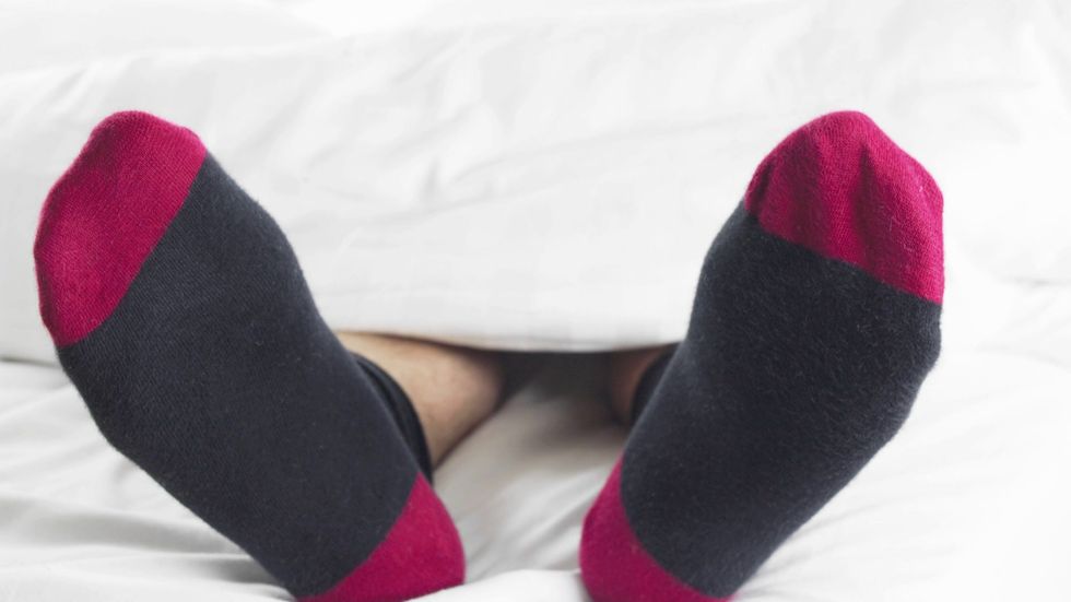 When I am going to sleep on my own accord and getting all snuggly wuggly, I most definitely enter the comforting cove of my bed with my socks on. Ideally, I'd begin to read a few pages out of a book or perhaps peruse the interwebs (mind you, my feet are still within my socks while this is occurring). The moment I start feeling my mind drifting, I know it's time to hit the lights. But do my socks come off now? Nope, not yet...