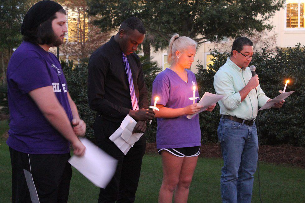 When we arrived to our destination in front of our school's chapel, we passed out candles as several students spoke and the sun set. A prayer was said first by Father Baylon asking for peace and unity during this time.