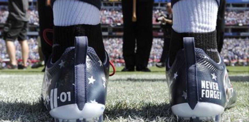 Switching gears to less of a fashion statement from celebrity designer support to supporting our troops and remembering the lives that were lost on 9/11, the NFL warned players prior to September 11th that they would be fined for wearing any patriotic gear that violated its uniform policy.