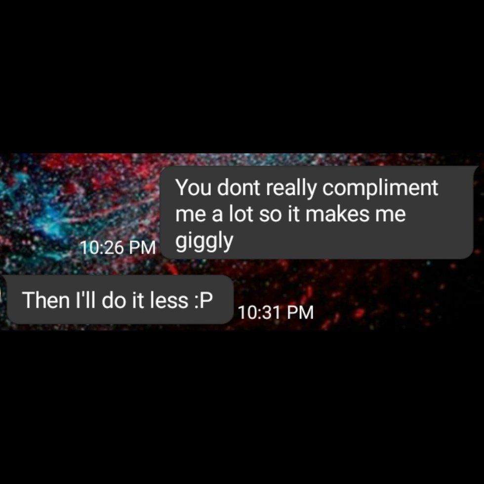 He doesn't want to go see the lights on Riverside and he doesn't even PRETEND that he'd enjoy that at all. He doesn't send cute good mornings. He doesn't come over every time I ask him if he wants to. But, he doesn't lie about why he doesn't want to do those things. That's just not who he is as a person, and that's 100% okay. I'd rather him tell me that things like that don't interest him instead of me dragging him along and him complaining the whole time, or even after. He doesn't say sappy things that would make the cynic in me throw up. Our conversations are rarely deep and "meaningful", yet they mean the world to me. Being able to talk to someone and not feel pressured to conform to society's standards as a couple is one of the most relaxing things...even if I am trying my hardest to think of a comeback only to have that be a gigantic flop.