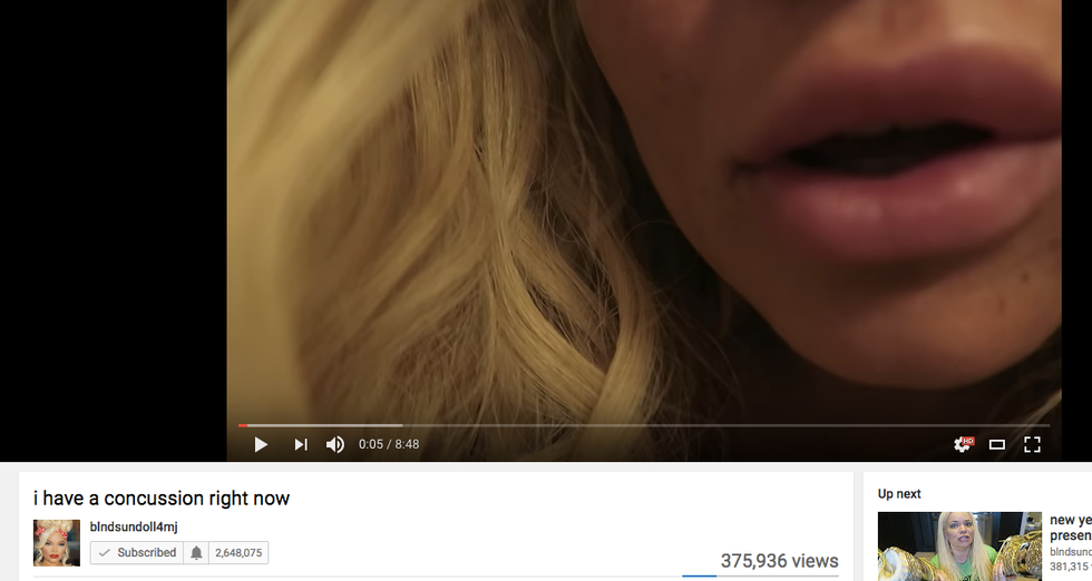 Somehow she's concussed herself. The video begins with Trish leaning in close to the camera and whispering in a manner that is at once amusing and concerning, as most things she does are. I don't think she realizes she doesn't need to be whispering, but apparently she's "scared to talk".