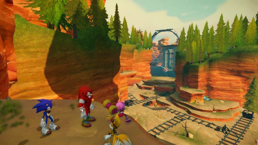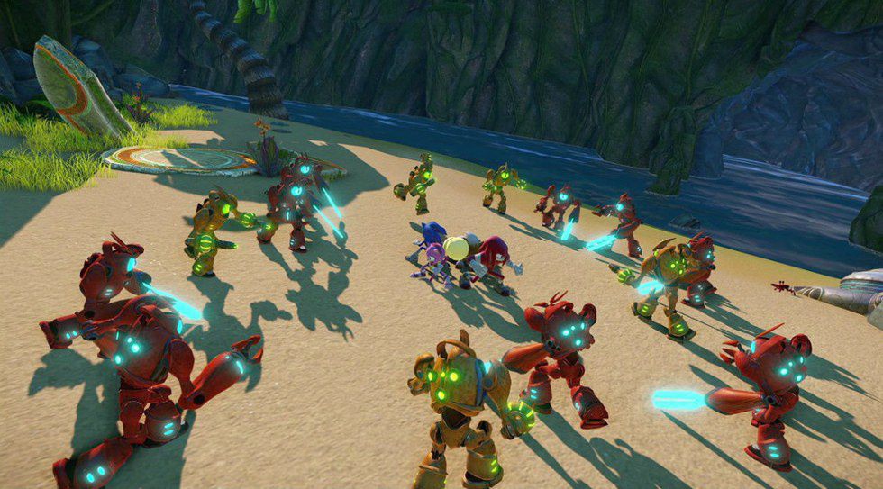 The heroes get a lot less distinct during fights, however. Combat is simple; Everyone has a single attack combo, as well as a midair stomp, a charged attack, and an energy tether that can lasso and throw enemies around. The combat's simplicity wouldn't be so bad if it were woven more naturally into exploration; instead, most of it unfolds in boring arenas, meaning robots attack in waves and you can't move on until they're all in pieces. It quickly becomes a chore, and it's not particularly challenging, either. The heroes have a shared pool of rings that act as their collective health meter, and while these are capped at 100, every environment in Rise of Lyric is filled to bursting with the things. Should you actually die, you'll just respawn nearby, with your enemies just as weakened as you left them. This cuts down any potential frustration, but it also strips out any trace of actual difficulty, meaning you're free to simply hurl yourself against enemies until they're all dead.