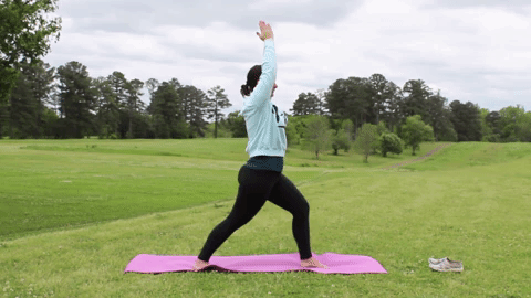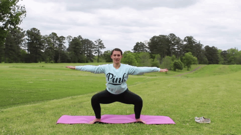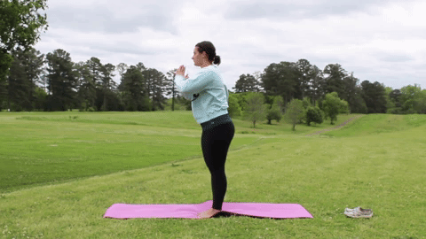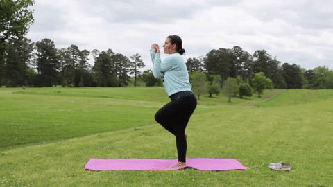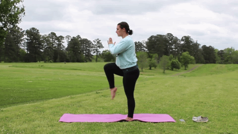 This is a pose that requires a lot of balance. You essentially wrap one leg around the other and intertwine your arms to do a very mild squat. If you’re having a hard time balancing during this move, you can make it less demanding by putting your feet close together and doing a squat.