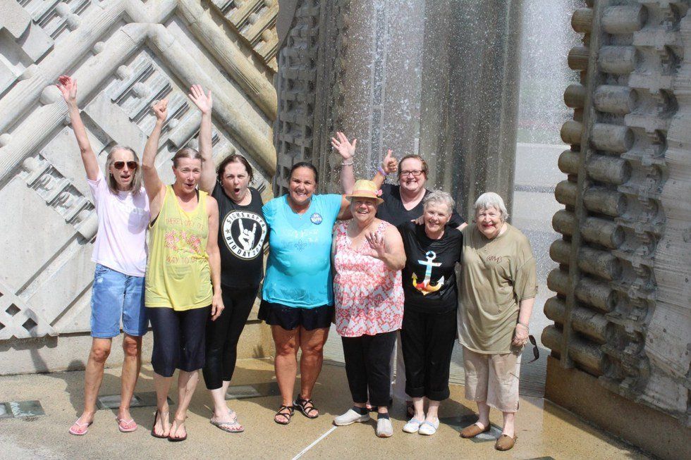 Basically the moms who wanted to participate all met at Kappa Kappa Gamma this year to wait for the Boilermaker Special, or as the house mother at Gamma Phi Beta, Marj Strasser, would say “that choo choo train,” to pick them up. While riding in such style they waved around posters encouraging friendship and loyalty while yelling “Go Greek!” Finally, the passengers were let off at the fountains and spent time running through as members of the Purdue community. Some did it more than once and one, who has 80 years under her belt has done it every year so far! After their fun in the water and sun they made sure to snap some cute pictures before heading back to the train.