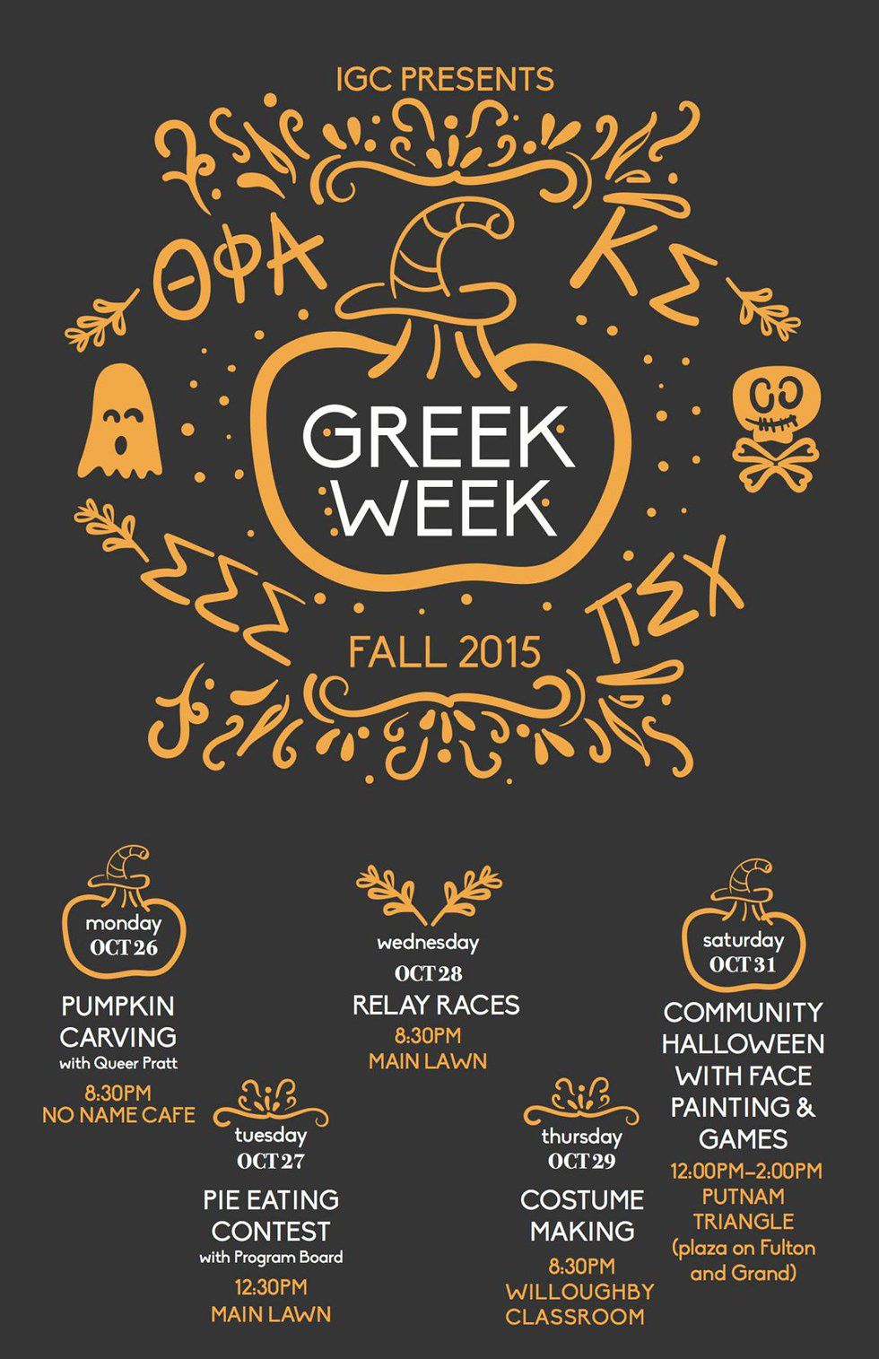 To be up to date with Greek events, "like" the Pratt Greek Life Facebook page or follow on Instagram @pratt_igc. This week is Greek Week!!! All the events are open to all Pratt students and this year is Halloween themed, so come out and meet us! GO GREEK LIFE!!