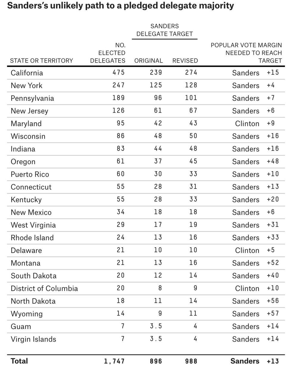 On March 30th, 2016, Nate Silver released an article titled It's Really Hard To Get Bernie Sanders 988 More Delegates ,which listed Sander's revised targets in order to reach a majority of pledged delegates. Upon releasing these newly revised targets, Sanders went on to win the Wyoming caucus and Wisconsin primary. Regardless of these wins, Sanders failed to meet his newly revised targets which were as follows: