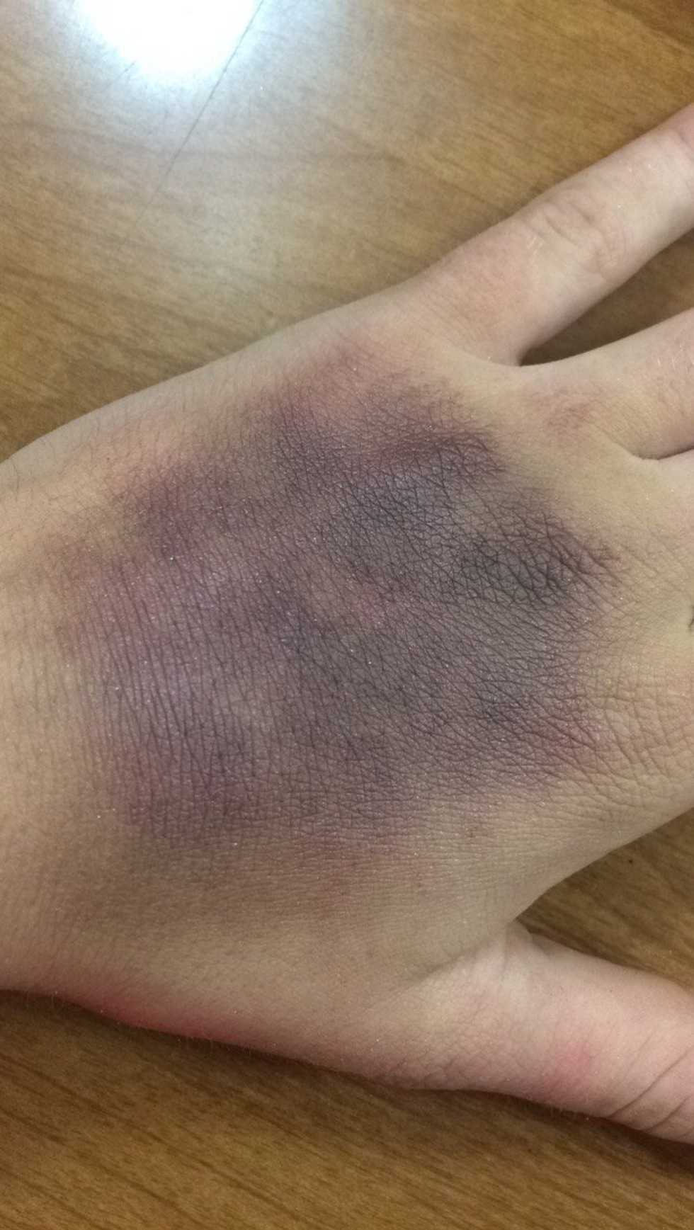 Apply foundation to your skin that is one shade darker than your skin tone. I used Covergirl Clean® Soft Honey Oil Control Foundation, which I found conveniently at Walmart for $5.35. Spread it evenly on the area of skin that you are covering with the bruise! (It may be hard to see in this photo, but there is foundation on my hand!)