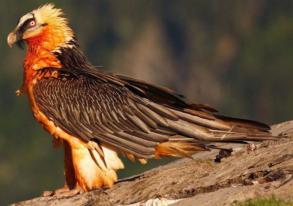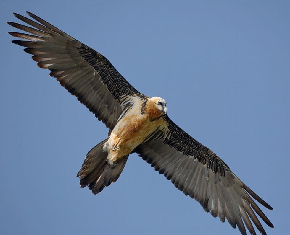 The bearded vulture, Gypaetus barbatus, also known as lammergeier or lammergeyer, resides in mountain ranges in Africa, Asia, and southern European countries such as France, Switzerland, Austria, Germany, Italy, and Slovenia and within the Alps, according to World Wildlife Fund (WWF). The colors of their feathers can vary, from white to beige/a dirty yellow, with grayish black wing and tail feathers. They have a black strip traveling from their intense red and gold eyes down to their beak, ending in a tuft of hair below their beak that gives them their name. The vultures have a wingspan of about 2.7m (8.9ft).