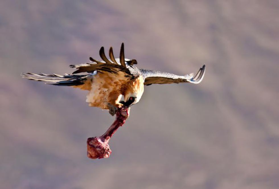 The bearded vulture is the only animal species that feeds primarily on bone. Unlike other scavengers that go directly for leftover meat on a carcass, the bearded vulture will go right for the bones. When it finds a promising bone, the raptor picks it up and soars high above the mountain cliffs. It then drops the bone on the jagged cliffs in an attempt to crack it into smaller pieces and expose the bone marrow inside. Sometimes multiple attempts are made until the bone splits. When it does, the vulture will eat the marrow and swallow pieces of the bone whole. Their gastric fluids are very strong, making them capable of digesting bone with relative ease. Food is not as hard to come by for the bearded vulture, as they have no competition for this food source. However, they will still chase away any other scavenger that may be on a carcass they wish to forage from.