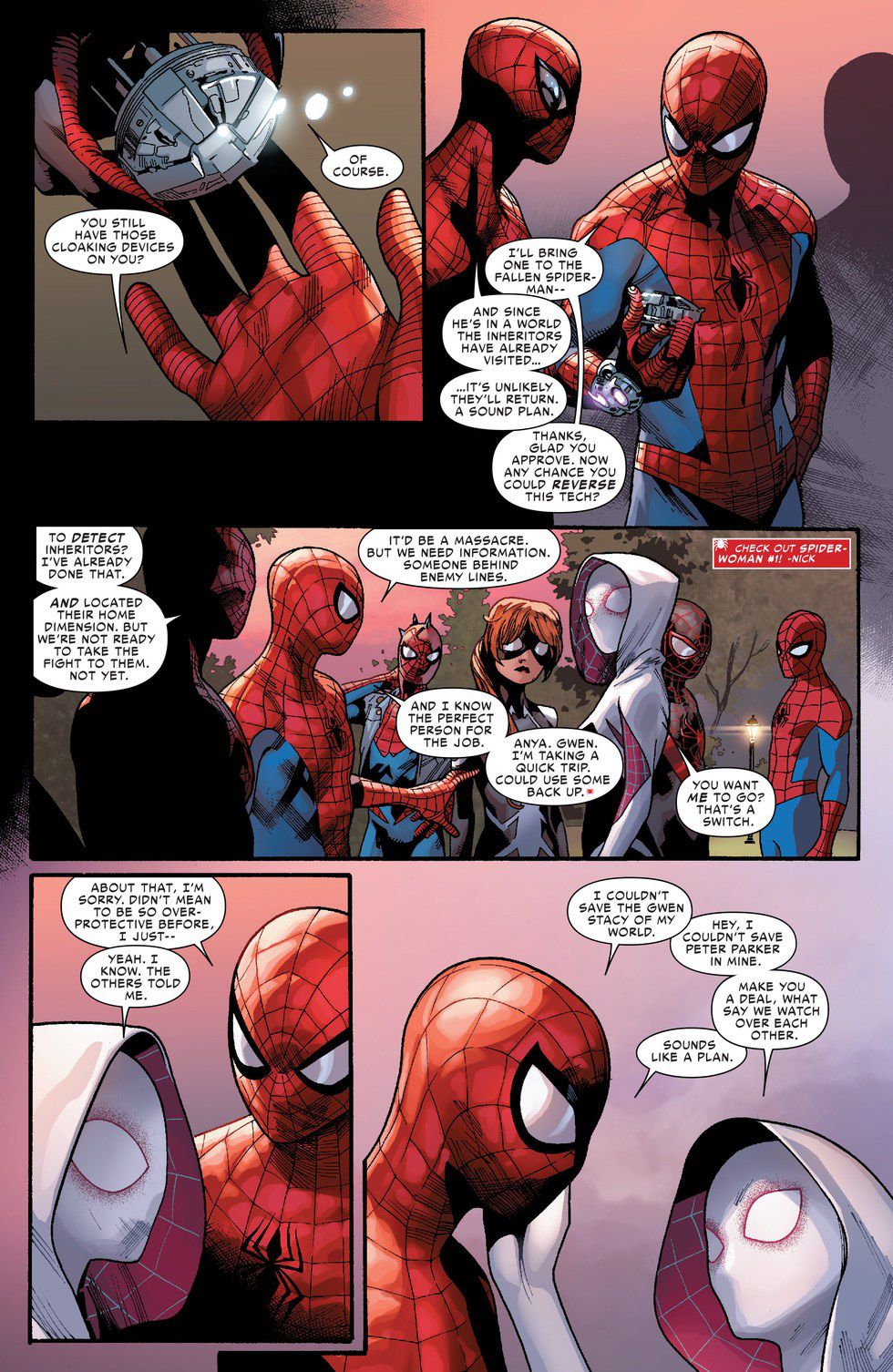 Something I don’t love about a lot of these recent gender-bent heroes is they tend to replace the former version completely. Thor was unworthy, so stuck around for a bit but ended up vanishing when Jane Foster took up the mantle. Ironheart has an AI version of Tony Stark, but what do you know, he’s missing too. With Gwen, we get the best of both worlds (pun very much intended). Not only do we get both heroes, they even fight together! I love Peter, and I love Gwen. Not having to lose one for the other is one of my favorite things about this series.