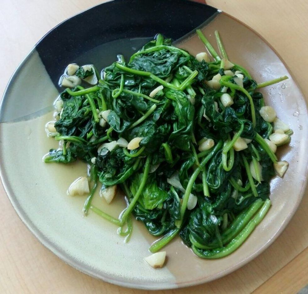 Stir-fry is an easy cooking method that takes a little time and preserves the natural taste of the food. In the following, we will only use garlic to remove the grassy flavor of the spinach and salt for seasoning.