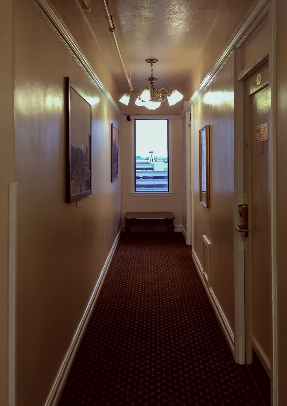 Just weeks after the hotel's grand opening in 1928, 22-year-old Leone Jensen jumped to her death from the roof of the hotel. Described by the newspapers of the time as a "pretty blonde," guests today still report sightings of a woman in white roaming the halls and disappearing to the roof. The tragedy of Leone Jensen marks the inception of the hotel's ghostly reputation.