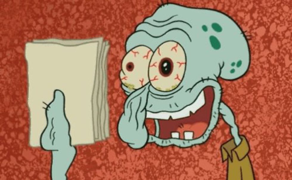 At last, you finish the exam. You bubble in the final answer, check it over once more to make sure you didn't miss anything, and hand it in at the front to the exam proctors. Though your eyes are bloodshot and you look like this emotionally-dead Squidward, you're done.