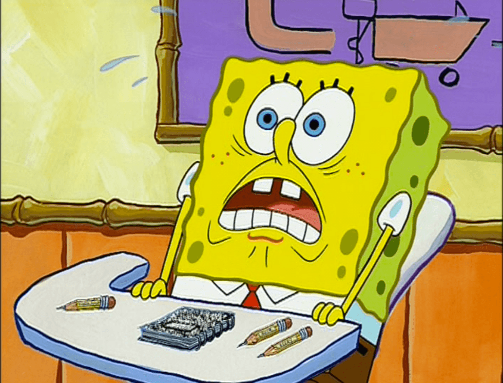 You're taking the exam, and you have a brain fart. It happens to the best of us. As you try to recover from the brain fart, you internally scream and feel like this Spongebob who looks like he might spontaneously combust at his desk.