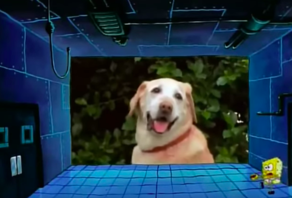 Spongebob is mind controlled in this one by Plankton so that he can steal the Krusty Krab formula. While he is walking Spongebob into his restaurant he yells "This is my lab" we then see this picture of the golden lab "And this is my laboratory!" and then we see his laboratory! But this is just a cute play on words that I love.