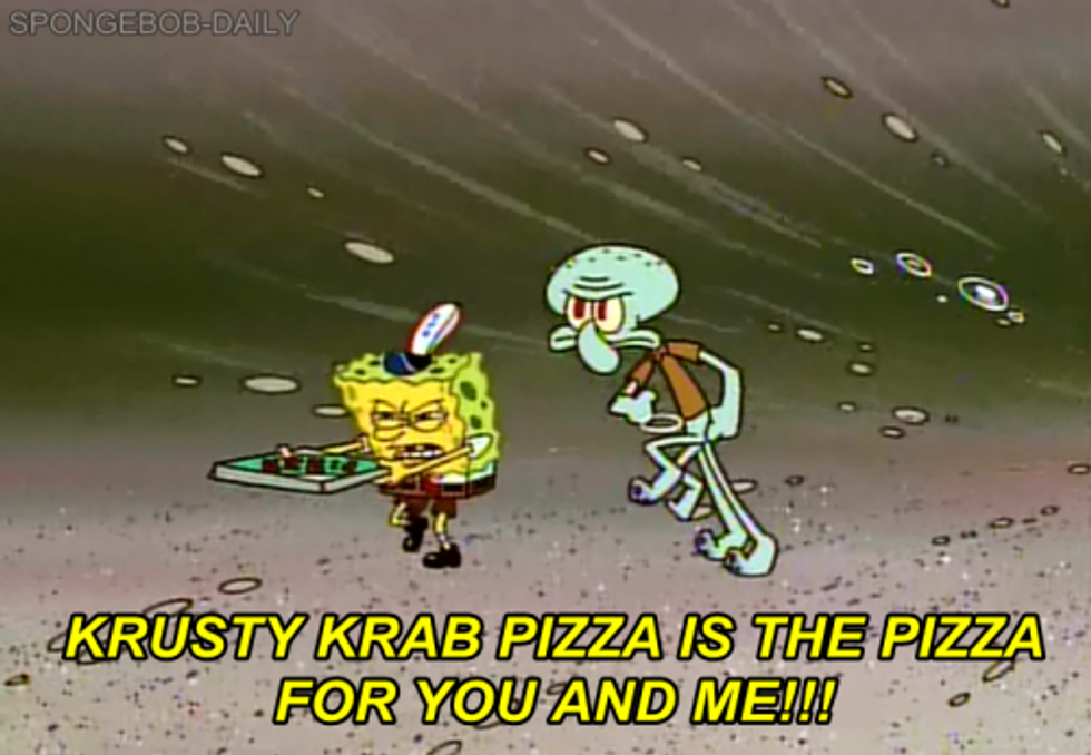 I don’t know about you all, but if I had a dedicated deliverer like Spongebob who would walk through the elements and sing such a soulful song about pizza, he would definitely be receiving a tip.