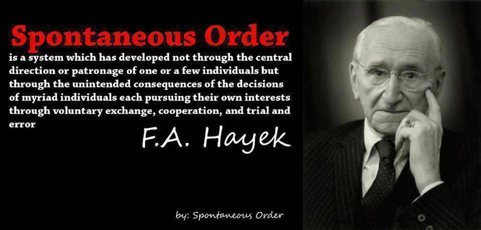 Human beings coexist with two types of order according to late economist F.A. Hayek, in his works Law, Liberty, and Legislation. The first state of cohesion he describes as "grown" and the other as "made". He refers to these two types by their Greek names kosmos and taxis. Grown is the the concept of spontaneous which can be described as a cohesive and functional organism which operates toward a purpose and arrives at rules that demonstrate continuity over time. Hayek presents a beautiful description of this Kosmos society, where expectations match intentions thus producing a system of order. Where he defines order as a system of multiplicitous dimensions in which every dimension or variable has an expectation that proves correct in it's outcome. At this point it becomes imperative that one recognizes that each facet of this organism or organization must retain its sense of order and continuity so as to achieve a purpose. However, sometimes there are circumstances in which the natural order of human existence can be manipulated by an external force or a central planning committee of sorts. This being the case, when an exogenous force intervenes and attempts to muddle this natural order in a unique way that is unfamiliar to this coalition of individuals or variables that has already established a continuous system of order, often consequences begin to arise, and the initial intent of the external party is unsuccessful. Spontaneous order is the natural and efficient way in which a coalition of individuals who possess the most amount of knowledge regarding their environment establish social order and function amongst one another.