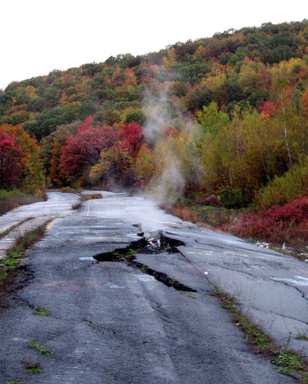 In 1962 a landfill burn went horribly wrong and sparked a fire in an abandoned coal mine which quickly spread into the veins of the coal deposits that had once brought prosperity to Centralia. The town has been smoldering ever since and the underground fire is expected to continue to burn for 250 more years. To this day it burns and smoke and noxious gasses escape from every nook and cranny. When the initial damage was done the 140 acres of land had been scorched, homes were leveled, and the highway was closed because the fire caused gaping sinkholes spewing fumes. Centralia had a population of about 2,000 when the mines caught fire and most of them left, but the towns official population is at 20 now, those who remain adamant that the doomed city of Centralia is their home.