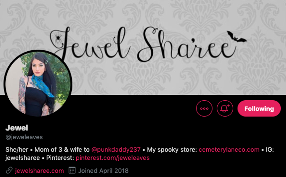 Popular for her spooky and chic style and her equally as cute family, Jewel has her own shop, 'Cemetery Lane,' where she sells Halloween-inspired clothing and home goods year round.