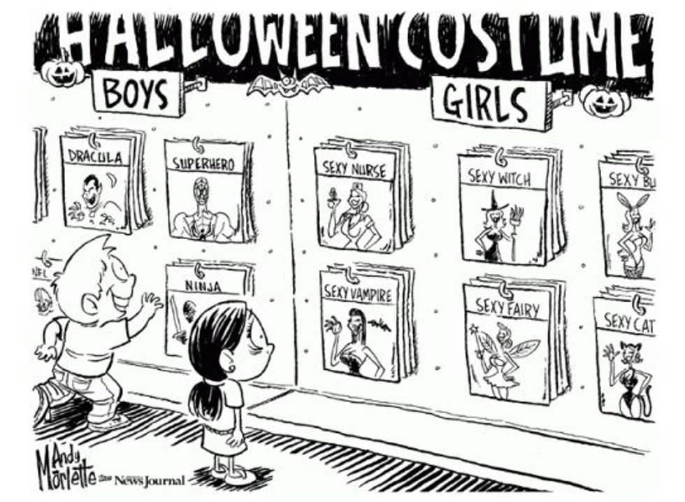 These feminized costumes conform to the princess culture girls are brought up in. Even after childhood, women are still confined by the restraints of princess culture, but instead of Halloween costumes being adorable, the costumes become over-sexualized.