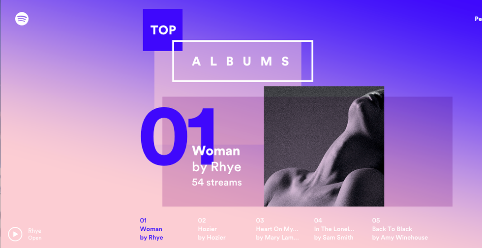 Rhye is amazing. I am the most proud I have ever been of myself when this stat popped up in my Year in Review. Mary Lambert is my favorite female musical artist. I saw her perform live in 2015 and I listen to her album every time I take an airplane anywhere. I also always cry because it's just so damn beautiful.