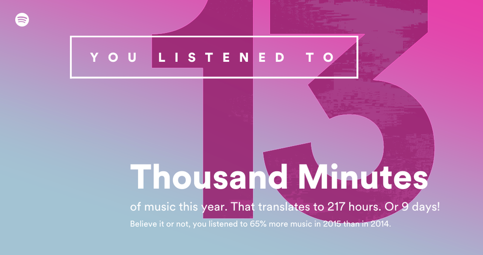 If you have a Spotify then I highly recommend taking a trip down memory lane right now with your “Year in Review”. It is basically the standard statistics gathering tool that looks at everything you’ve listened to in the past 12 months and packages it all up in a pretty format just in time for Christmas. It’s the perfect way to see how much you truly listened to “Hello” by Adele in the past month since she released it. My “Year in Review” also started some unexpected fights of music snobbery. It was pointed out to me that my top songs only had roughly 35-40 plays and then it was so rudely suggested that I “just don’t listen to music that much.” I scoffed at this and then the next screen showed that I listened to almost 2,000 different artists this past year. *props to me* The musically delinquent adult-child that hinted I was an uncultured swine for my small amount of song plays had only listened to about 500, their top artist being the “Glee Cast” to this they responded “quality over quantity, right?”