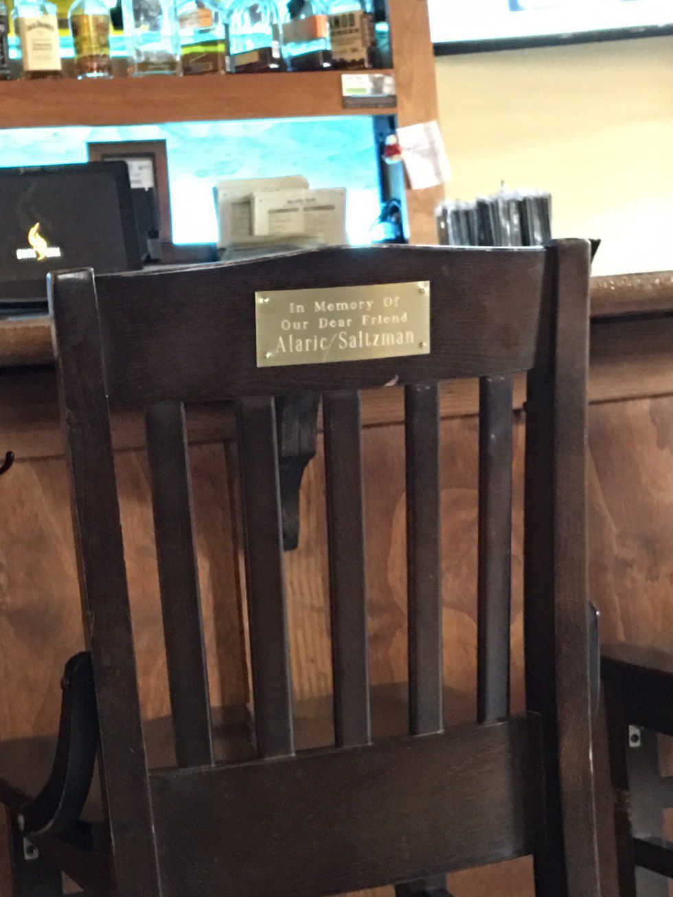 My fiance and I began looking at our menus and deciding on food when I looked to my left at the bar we had been seated next to. During my glance at the array of drinks that any vampire, hybrid, or human would enjoy I noticed something on the back of one of the chairs at the bar. I scooted to the edge of my seat to get a better look and had to keep myself from shrieking once I read the words engraved on the plaque that said, "In Memory of Our Dear Friend Alaric Saltzman."