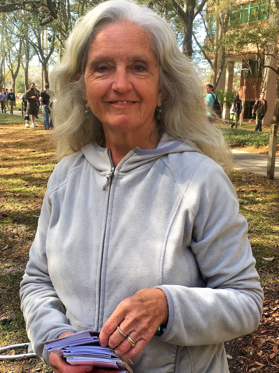 After some inquiry, I found out the woman's name was Patte Smith (pictured below) and she is a frequent visitor to college campuses, abortion clinics, parades, and other public areas to spread her message of love and God. She grew up in a Catholic home but didn't truly believe at the time. Smith described her young self as "Godless". She didn't truly feel her belief in God until her friend gave her a bible as a gift. After reading, she felt enlightened. "I felt as if the Bible was reading me," Smith recalled.