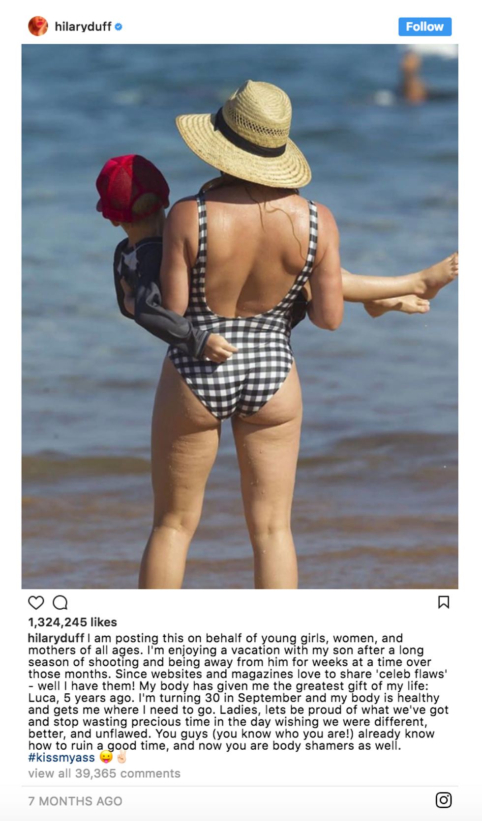 Hilary Duff has been outspoken even today on social media today about Body Positivity. She has been quoted saying "I didn't always love my legs, but as I've grown, I've learned to love and celebrate myself, just as I am...I began to realize that my legs are strong, and they carry me every single day." She spoke out against the recent tabloids that were body shaming her as she was on the beach with her five-year-old son. She took to Instagram to stick it to them.