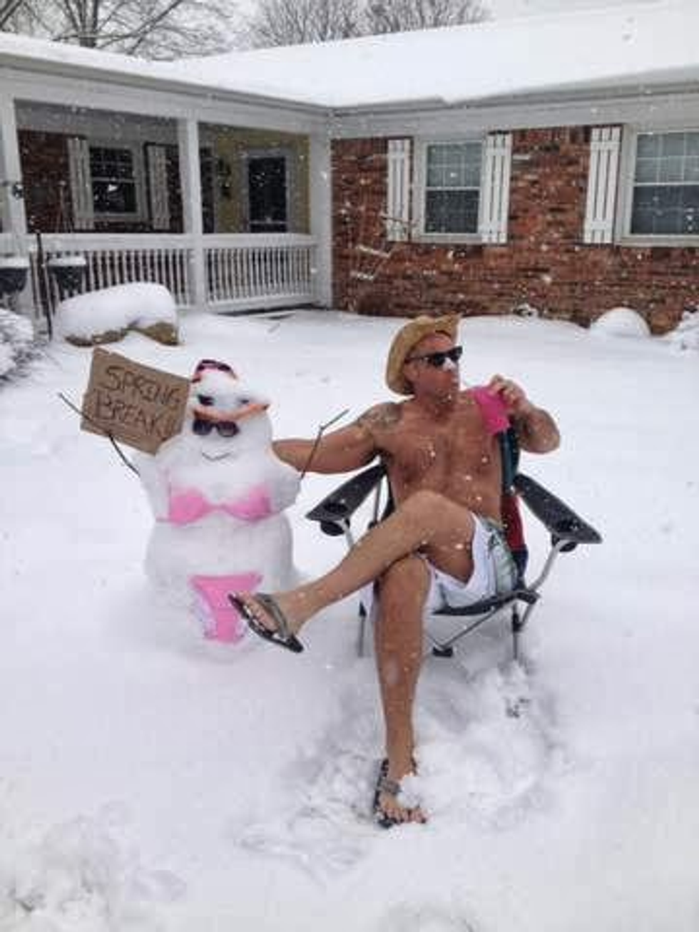 This has been on our list of things to do since New Year’s Day, but nobody was willing to face the 10-degree weather to trudge through the snow just to take down the Christmas lights. So now, when the temperature is finally reaching the 50s, we choose to trudge through the mud to finally take down the lights.2. Shorts and Sandals when there is still snow on the ground
