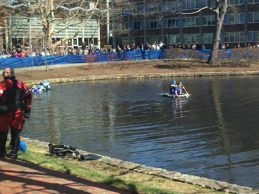 For about two hours during all of this was the pond regatta. Student-run clubs and houses crafted their own boats for the event in which they would row, paddle or swim their way to the center of the pond, around a buoy, and back. The most notable crafts were a bathtub with floatation cubes on either side; a raft made entirely from water bottles and tape; and an air mattress. The paddles were also diverse. I saw metal shovels, brooms, a giant bamboo pole, traditional canoe paddles and bare hands. One poor soul had to drag his craft across swimming because it would not stay upright. At the end of the race, President Hanno—such a brave man—stood on a log raft and allowed himself to be rowed around the pond. He wore dress pants and waved a Wheaton flag in his hand. I’m sure that was the one of the best parts of the weekend.
