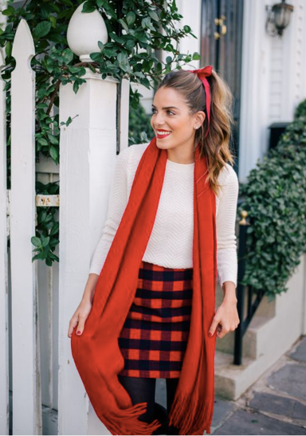1. Add a little pop of holiday color. Find a cozy knit sweater or jacket and spruce up any look. Pair with a skirt or a pair of trousers and this casual yet sophisticated look will do the trick.