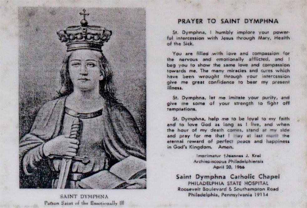 Good Saint Dymphna, great wonder-worker in every affliction of mind and body, I humbly implore your powerful intercession with Jesus through Mary, the Health of the Sick, in my present need. Saint Dymphna, martyr of purity, patroness of those that are suffering from nervous and mental afflictions, beloved child of Jesus and Mary, pray to them for me and obtain my request.