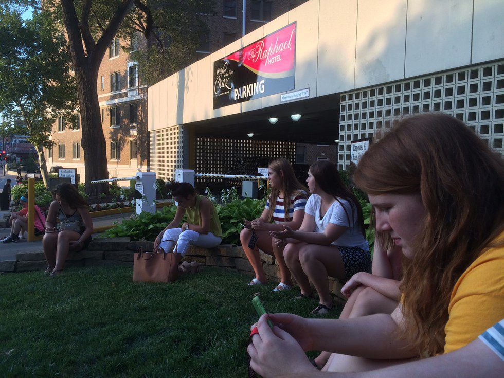 The owner of the Raphael had come outside and unceremoniously kicked us off his property (which really angered the Directioner Moms, though they were powerless in the face of his fury). So we were forced to slink around to the back and sit in the grass, keeping vigil over the entrance to the parking garage.