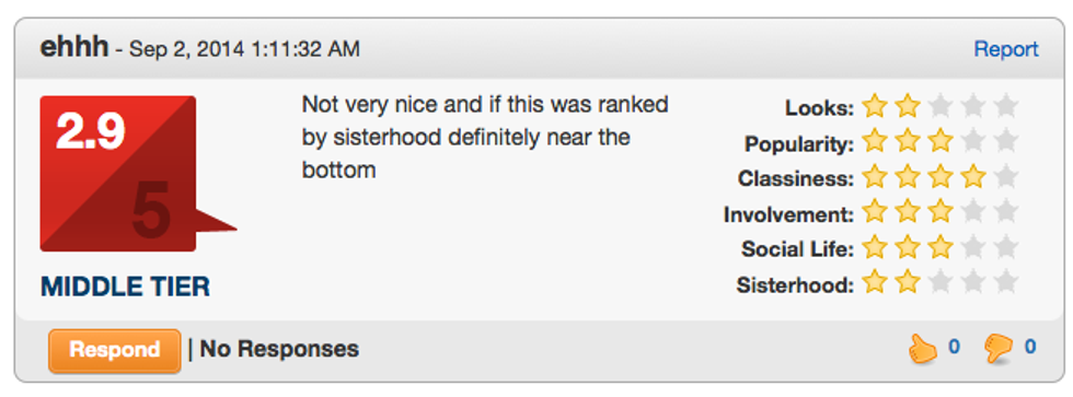 Now, it's not all superficial. GreekRank made sure to put a rating for sisterhood. Sisterhood: something we all pride ourselves on. One of the main things that make each organization so special to its members, but there are still comments like this: