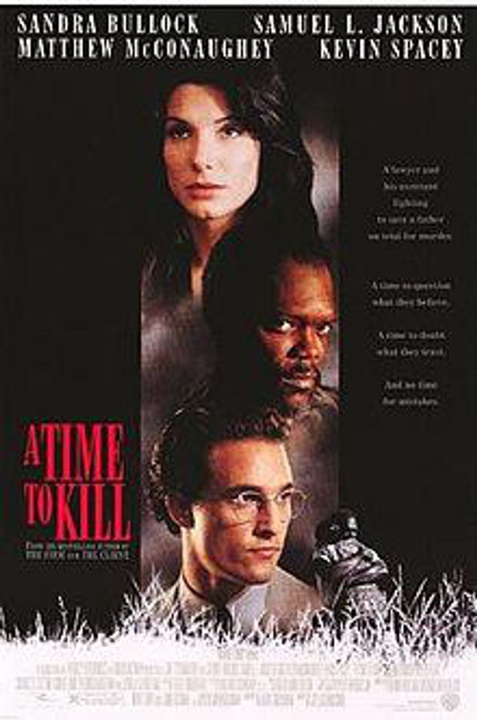 "A Time to Kill" is a 1996 American crime drama, based on author John Grisham's 1989 novel of the same name. With its own all-star cast of Sandra Bullock, Samuel L. Jackson, Matthew McConaughey and Kevin Spacey, with Kiefer and Donald Sutherland, "A Time to Kill" portrays the intense racism rooted in Mississippi.