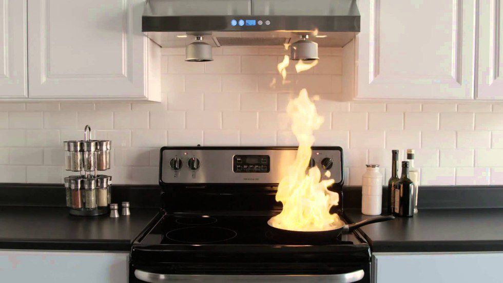 I once found a bottle of apple juice that had what appeared to be a giant closed eyeball floating in the middle of it, and was terrified to pour it out for fear that it would realize what was happening, open it's creepy eye, and stare angrily at me as I dumped it down the drain. So at any rate, I grabbed what I first assumed to be a can of grease, decided it was evolving fruit, and dumped it in the garbage disposal. My mistake became obvious as the contents slowly released from the can in one gelatinous wad, and disappeared into the drain with a moist thud. Figuring it was a bad idea to run that much congealed grease through my pipes, I rolled up my sleeve and shoved my hand into the garbage disposal, scooping up as much as I could as it squirted out between my fingers and oozed back into the sink. Eventually I got most of it out and grabbed a new can, which leads me to the second reason I shouldn’t be allowed near kitchens for awhile: the raging grease fire on the stove top. This was a completely unrelated incident that I actually thought was pretty cool, despite my wife's assertions to the contrary. It was an innocent mistake; I had just finished frying the bacon – which undeniably improves any dish it graces, including chili – and thought, “Hey, I’d better pour this grease into the can before it congeals and gets stuck on the pan forever!” However, while a good thought from the standpoint of reducing dish scrubbing, this turned out to be a terrible idea in practice. Apparently you’re supposed to wait until the grease cools off a little before pouring it out of the pan. The bacon people neglected to print that warning on their package…or maybe they did print it – in fact it may have even been prominent – I can’t imagine ever looking for instructions on how to cook bacon, so I didn’t read it. Unfortunately, that was only mistake number one; mistake number two was trying to pour from a scalding hot cast iron pan that weighs over 10lbs with one hand in a giant oven mitt, and the other holding a tiny pear can to catch the grease. Mistake number three, then, was attempting to execute this maneuver over the still blazing hot burner.
