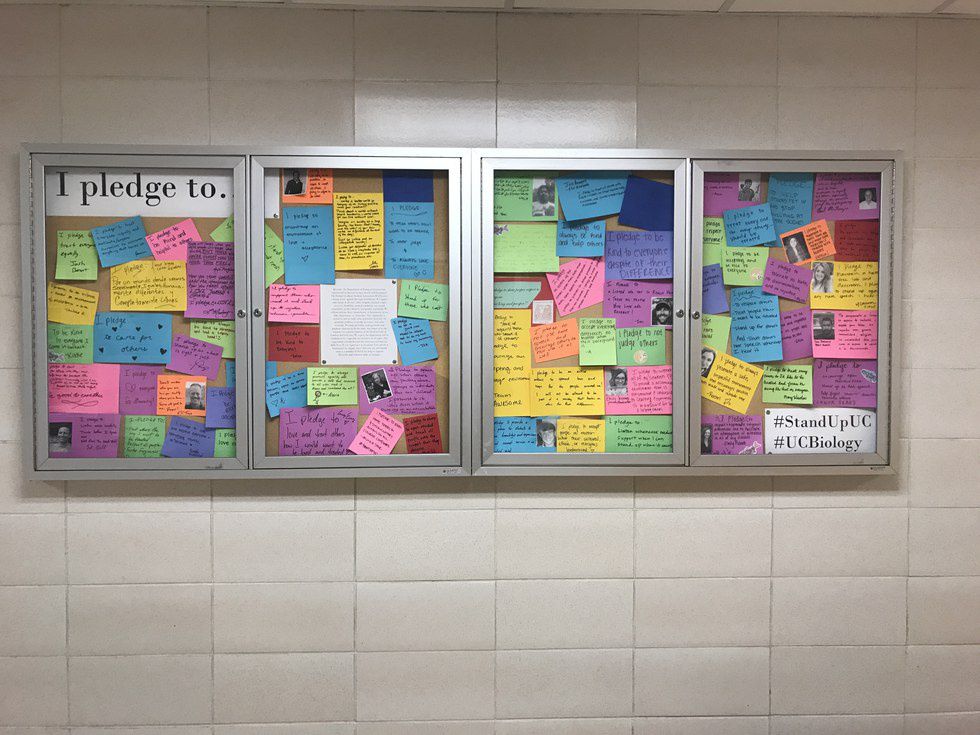 At the University of Cincinnati, I was waiting for my Microbiology lab to start when this board caught my attention. The board read, "I pledge" and it has paper and markers for anyone who walks past to create their own. It warmed my heart and made me realize the power EVERYONE has. Sure it is just one piece of paper on a random board in a chemistry building, but all of these together encouraged me. I've chosen a few samples and I hope they encourage you as well ❤