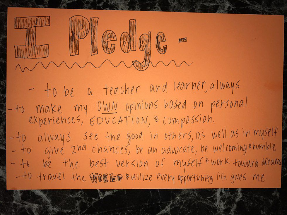 I pledge to be a teacher and a learner, always. I pledge to make my OWN opinions based on personal experiences, EDUCATION, and compassion. I pledge to always see the good in others, as well as in myself. I pledge to give second chances, to be an advocate, to be welcoming and humble. I pledge to be the best version of myself and continue to work towards my dreams. I pledge to travel the world and utilize every opportunity life gives me.