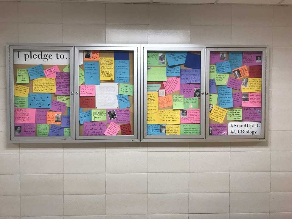 A note from the university: "Recently, the Department of Biological Sciences has experienced an increase in hate speech and harassment. The Biology Graduate Student Association (BGSA) takes a strong stance against against this type of behavior. We support individuals of all race, color, religion, national origin, ancestry, disability, medical condition, sex, sexual orientation, gender identity, and gender expression. We will not tolerate hate, intimidation, or harassment in our labs, department or classrooms. Our community is inclusive, and we both value and foster diversity. As graduate students, we pledge to respect and value everyone. We urge our fellow undergraduate and graduate students to do the same. Any behavior in the contrary is in violation of the Student Code of Conduct and state law. We expect our department and it's students to be respectful and inclusive at all times. This expectation extends beyond the classroom and into our daily lives. If you experience or encounter hate speech or harassment on campus, know that you can and should come to a member of BGSA for help or support. Diversity and inclusion makes us stronger."