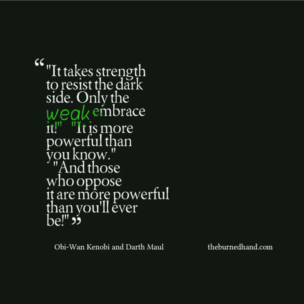 16. "It takes strength to resist the dark side. Only the weak embrace it. And those who oppose it are more powerful than you'll ever be." - Obi-Wan Kenobi