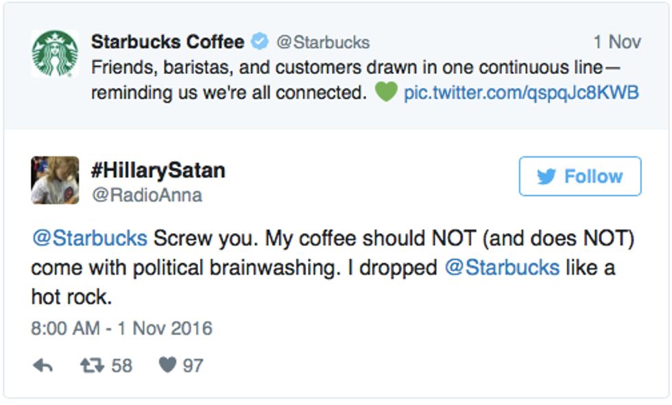 Starbucks CEO, Howard Schultz, explained the reason behind this cup in one perfect sentence. "Starbucks wanted to create a symbol of unity as a reminder of our shared values, and the need to be good to each other." In light of this election season that has divided us, don't you think he has a good point? I, for one, applaud him.