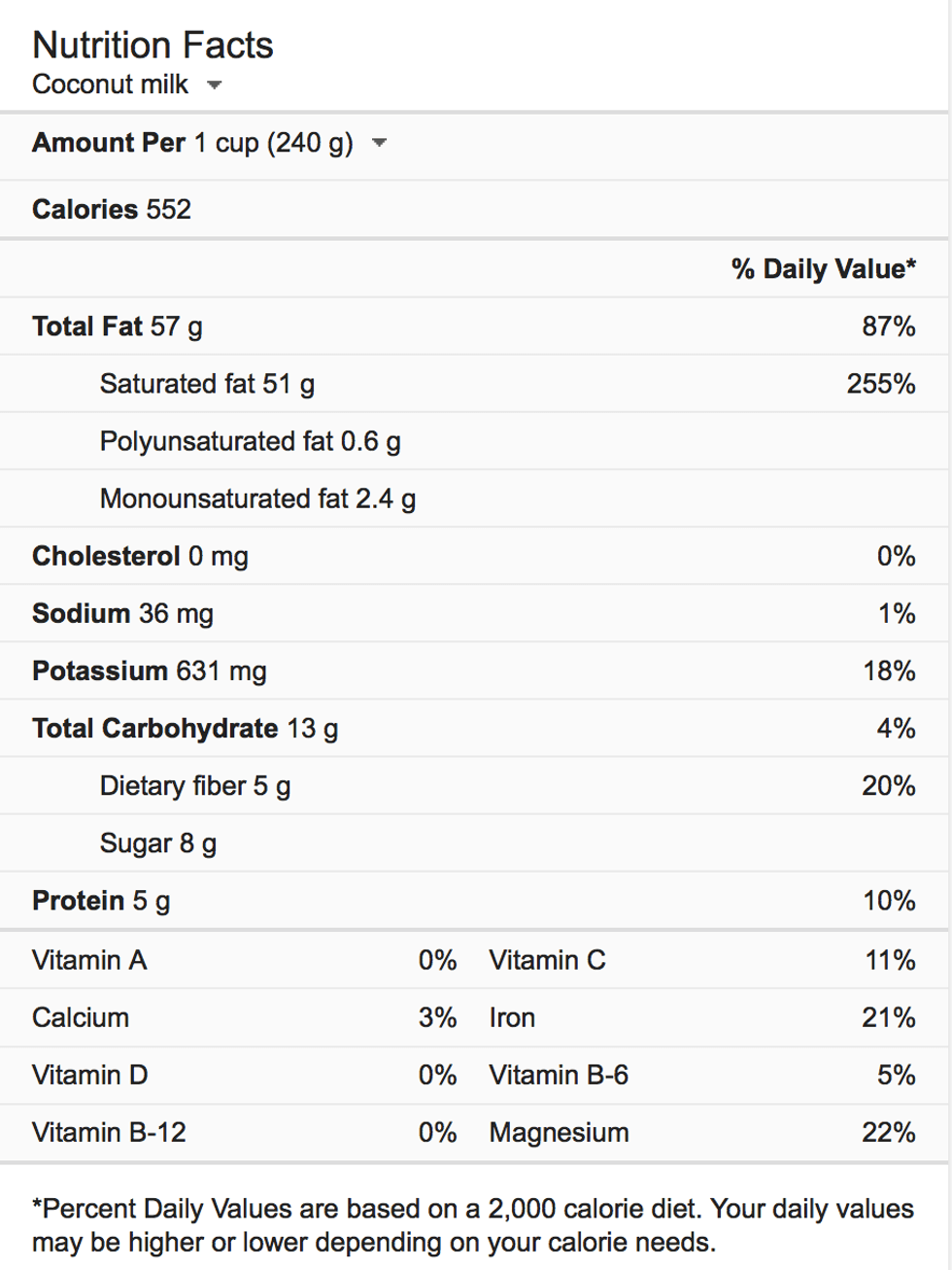 One of the first sentences I came across read something along the lines of "Coconut milk is an excellent source of fat for people on the paleo diet." I don't know about you, but I love chicken nuggets and chocolate milk way too much to be on the paleo diet, and an "excellent source of fat" is the last thing my college body needs. So, just how much fat? Is it enough that I can get away with it and maybe just run an extra mile at the gym later? (LOL.)
