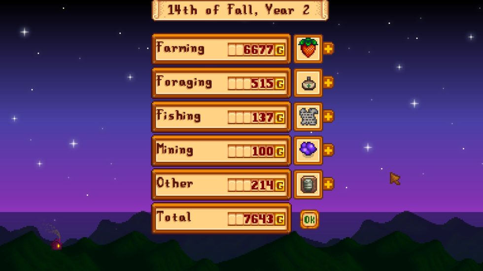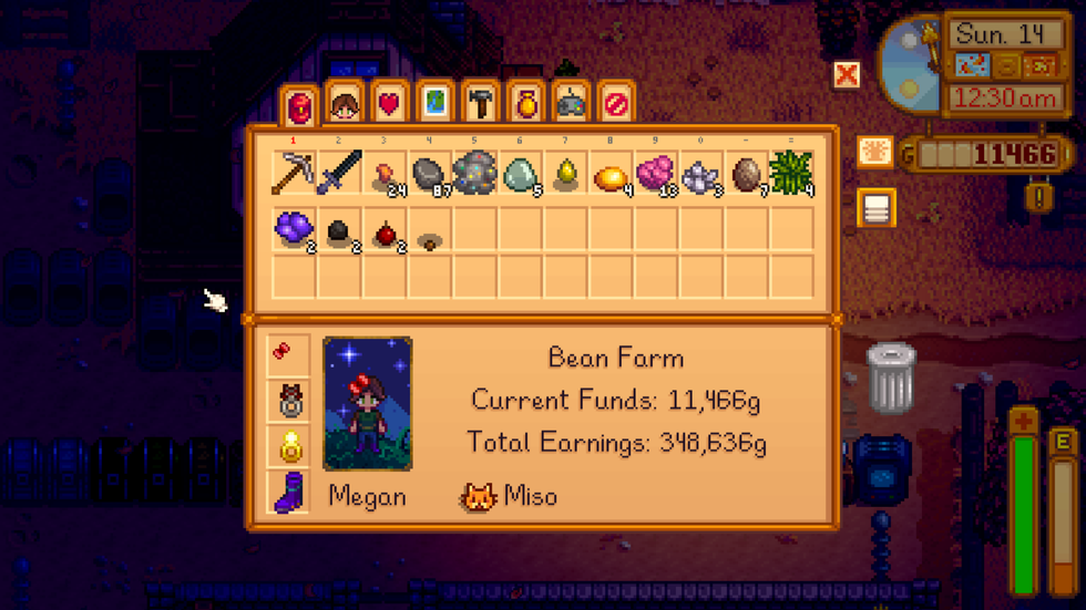 I made a lot of money tonight! One day I made 11,000 gold though, but this wasn't bad! Also I have a husband, Elliot. He's a writer. Sometimes he'll help me out around the farm by feeding the animals, or watering the plants.