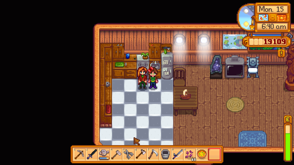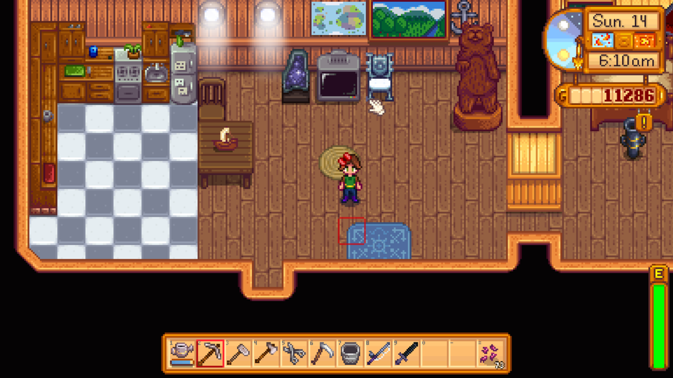 First thing in the morning, I wake up! This is my house; I've managed to upgrade it once so far and now I have a kitchen! I can make all sorts of stuff to get my energy back up and work more in the fields. The first thing I do upon leaving the house is take care of my crops!