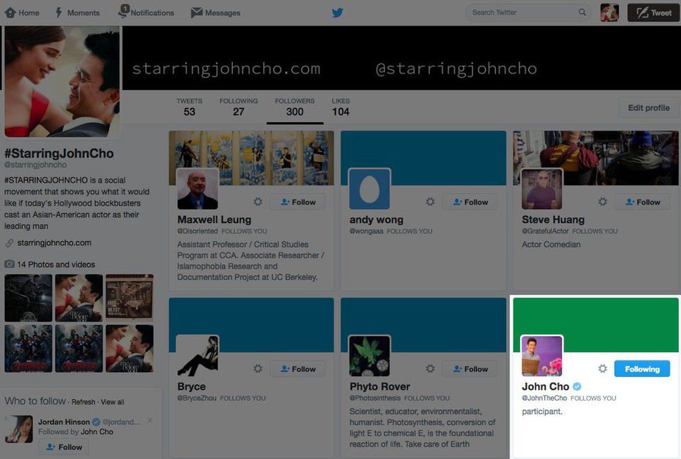 #StarringJohnCho is "a social movement that literally shows you what it would look like if today's Hollywood blockbusters cast an Asian-American actor—specifically, John Cho—as their leading man" (#StarringJohnCho official site). It re-images already-established films such as "The Avengers," "Jurassic World," and "Spectre" using the magic of Photoshop.
