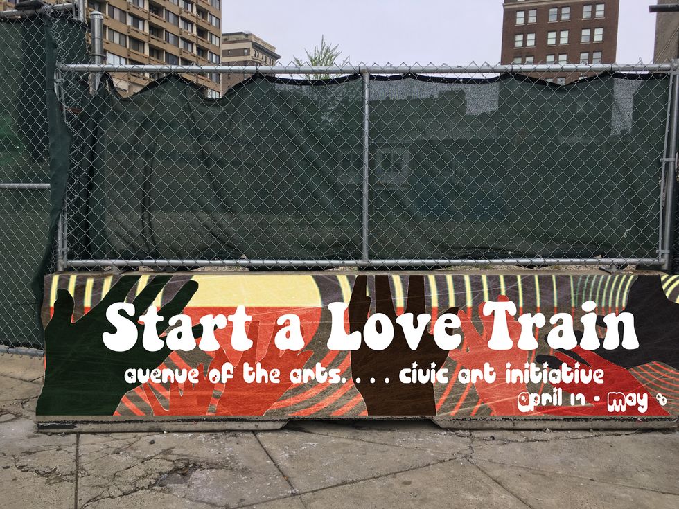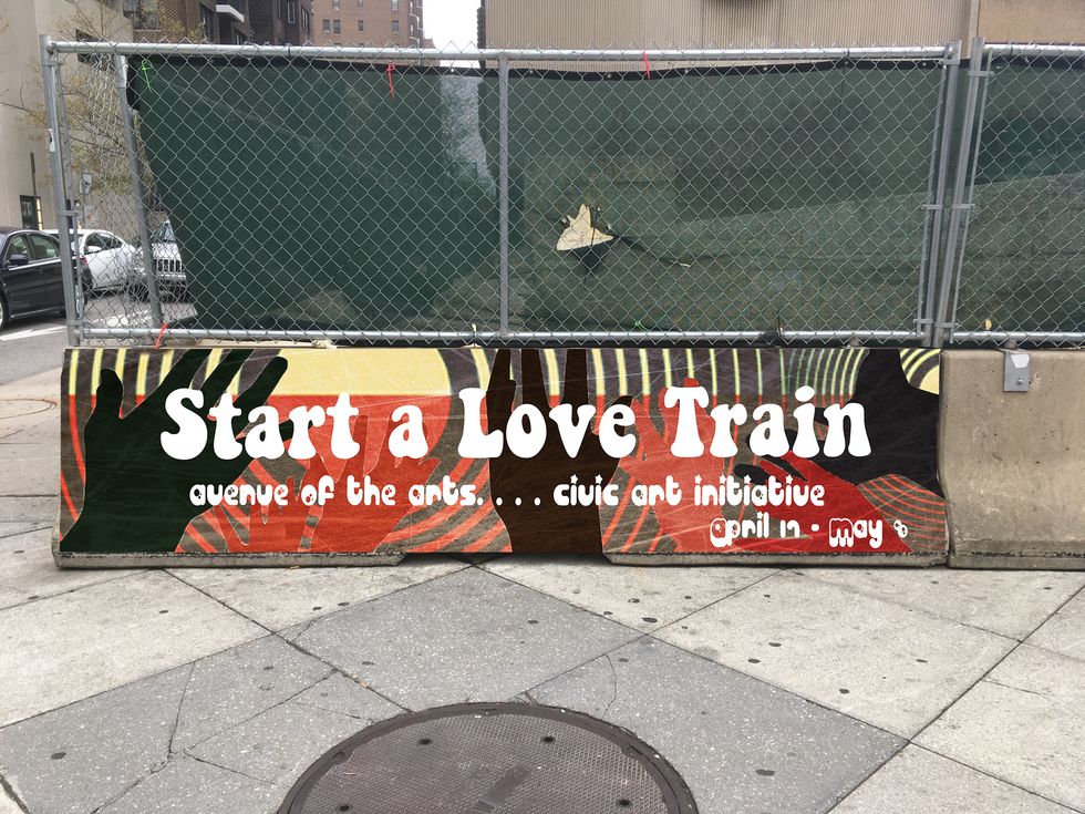 Recently, a group of students from a Collaborative Studio class at The University of the Arts decided to beautify the sad site. Appropriately, they have titled their exhibition "Start a Love Train." This title signifies the trainlike layout of the barriers while paying homage to the site's groovy history.