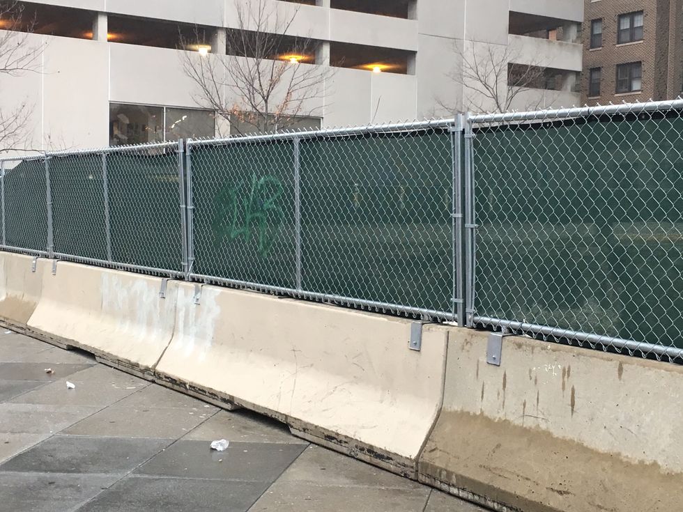 This prominent intersection is at the center of the Avenue of the Arts, in the center of the city of Philadelphia as well as being at the center of the campus of the University of the Arts. The multiple cement barriers, fencing, and mesh material shows an embarrassing lack of foresight considering the importance of this location.