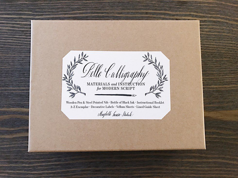 The kit comes with an instructional booklet, a wooden pen/nib holder with a nib, black ink, an alphabet guide, lined practice sheets, vellum sheets, and decorative labels.