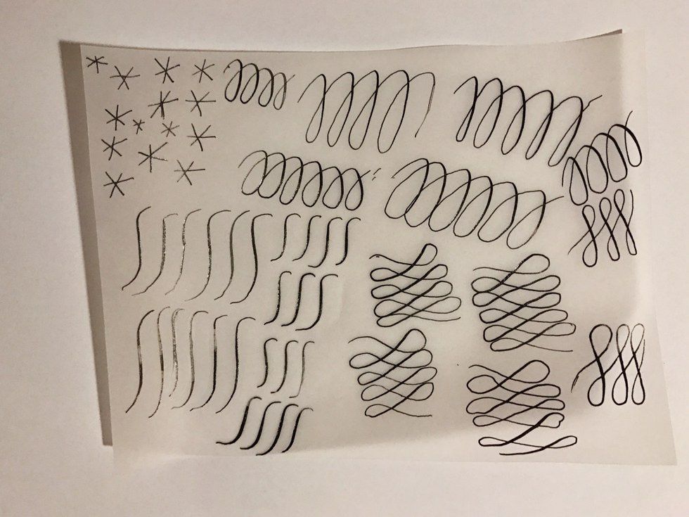 Maybelle shows little practice maneuvers to get used to using the pen. They get you accustomed to how the ink flows from the pen depending on how much pressure you use. I did several practice designs. It is harder than it seems!